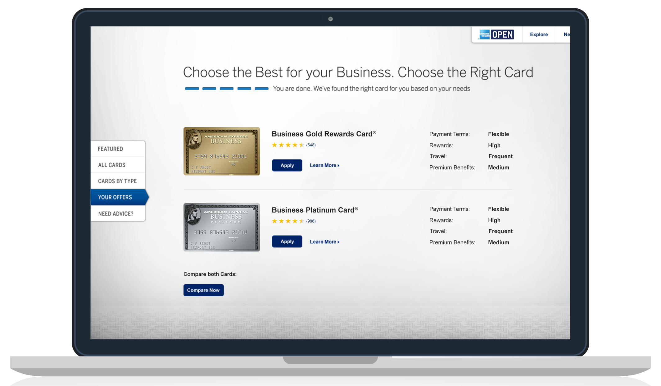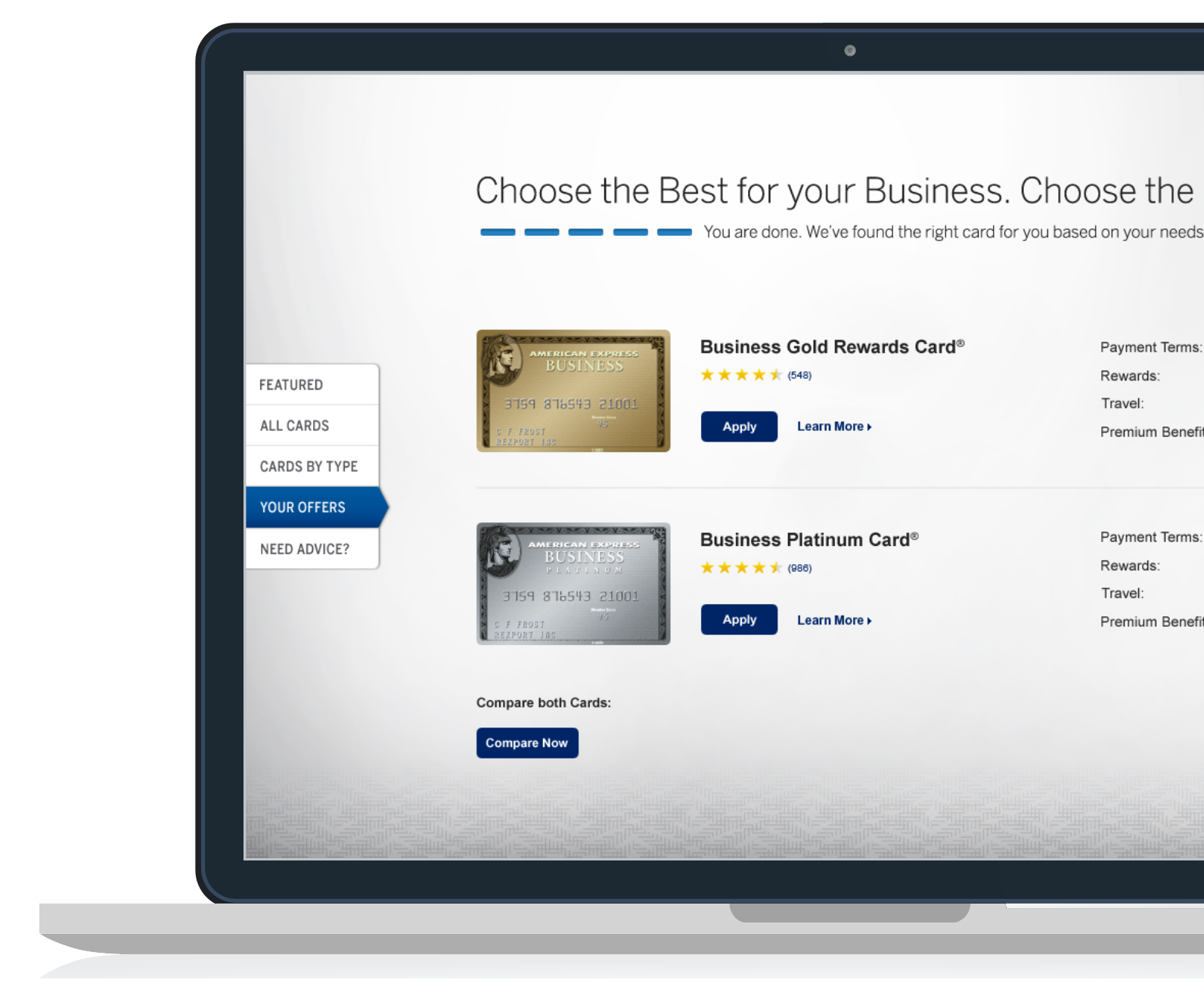 The interface presents recommended business cards side by side, making it easy to compare key attributes like rewards, payment flexibility, and premium benefits. Clear hierarchy, scannable labels, and prominent CTAs help users confidently move from recommendation to application without friction.